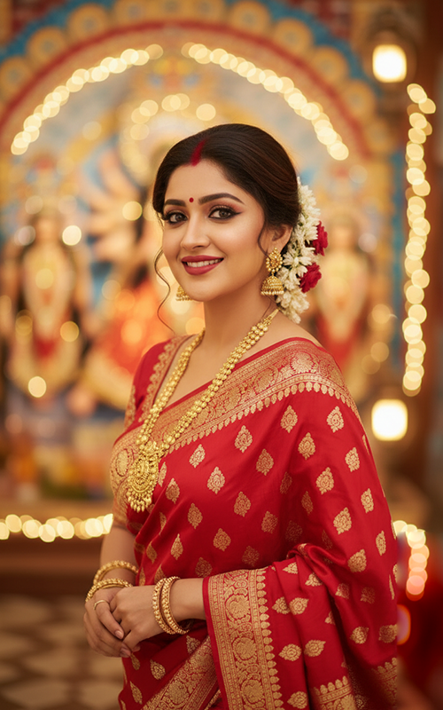 5. Cinematic pooja Portrait of Woman in Red-Gold Saree with Festive Makeup and Pandal Lights