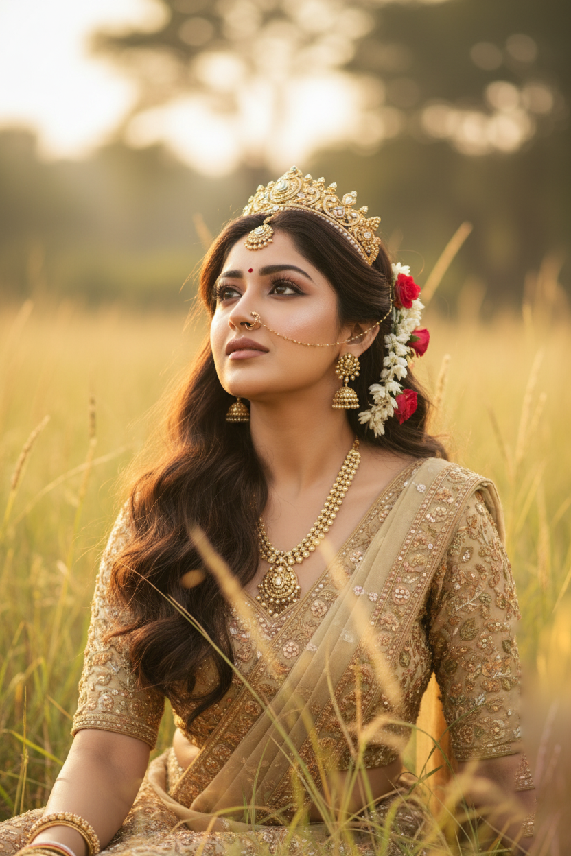 4. Traditional Indian Woman Portrait in Nature with Crown, Jewelry, and Flowers
