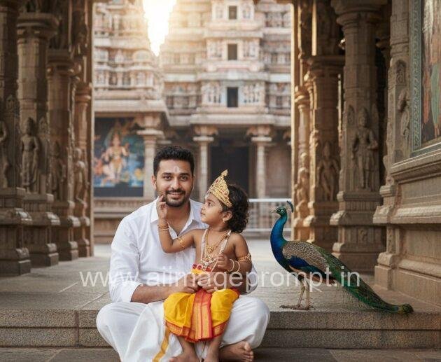 Create a Devotional AI Artwork: Man with Baby Krishna in Temple
