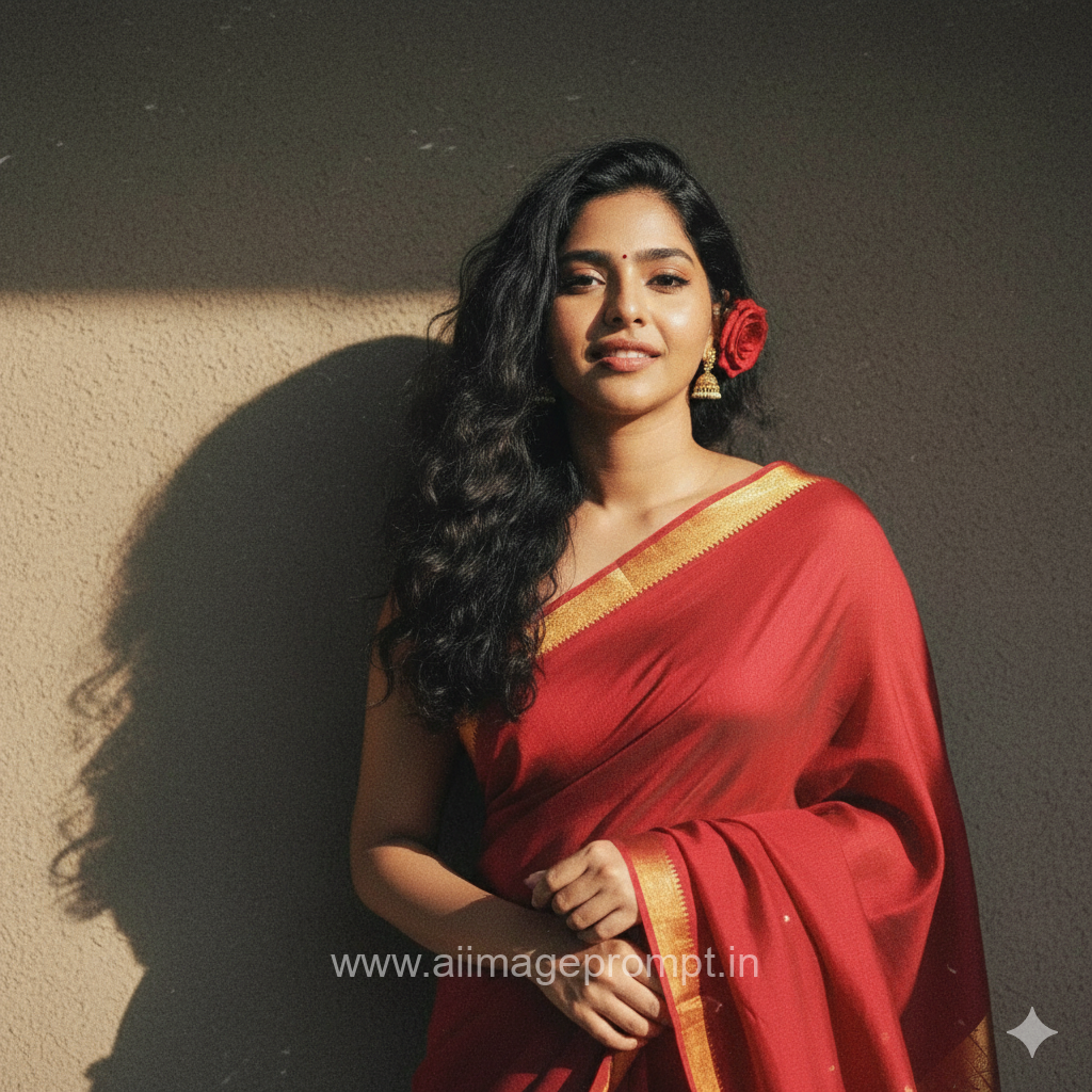 Retro allure shines through bold, timeless colors. Traditional AI Portrait Image Prompts Pick from vibrant reds, radiant yellows, or tranquil blues—each shade tells a story and enhances the saree’s character.