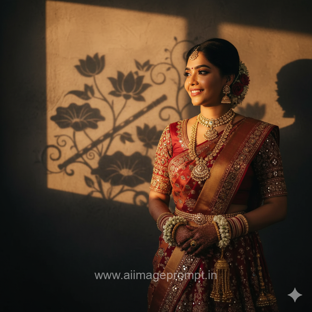 A captivating portrait of a young Indian bride in a traditional embroidered lehenga. She is adorned with beautiful flower garlands in her hair and on her wrists, and wears traditional bridal jewelry. A single, warm light source creates a dramatic shadow of flower garden with a flute on the dark wall behind her. The woman has a serene and joyful expression, looking to the side. Professional photography, cinematic lighting, realistic.