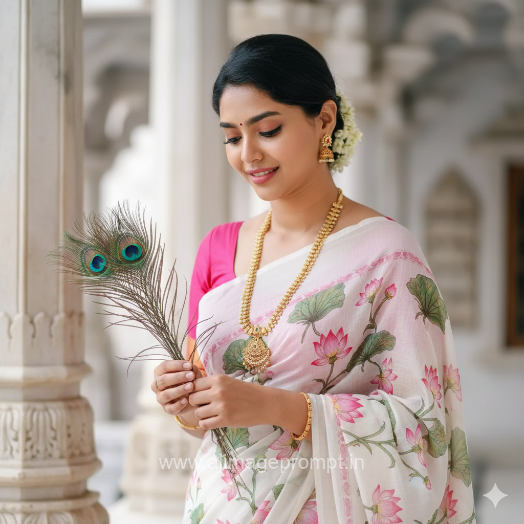 Outfit:- white colour saree with pink blause, saree are printed with flowers, Both hand hold peacock feather, and girl looking a feather pose,
