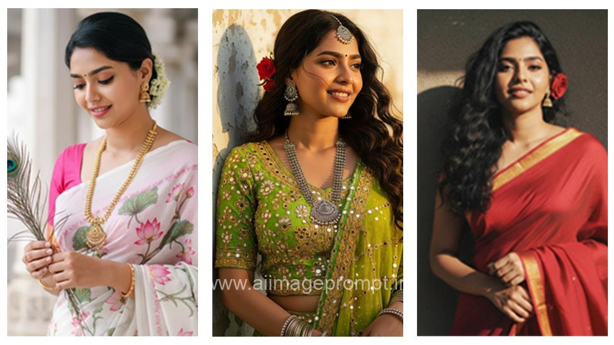 Retro allure shines through bold, timeless colors. Traditional AI Portrait Image Prompts Pick from vibrant reds, radiant yellows, or tranquil blues—each shade tells a story and enhances the saree’s character.